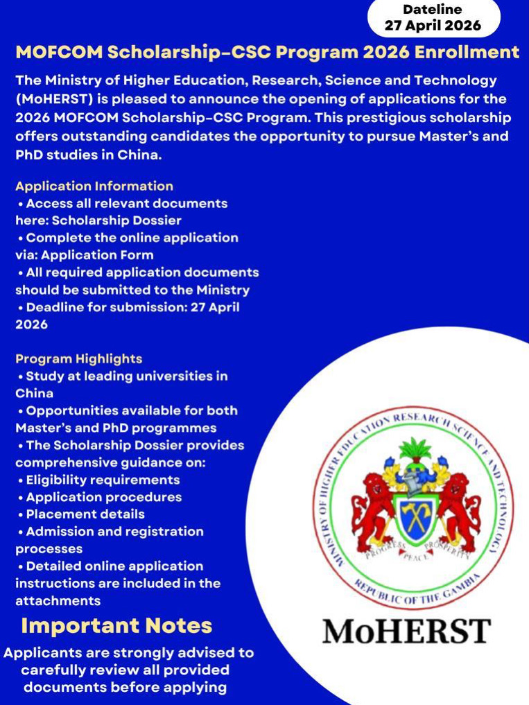 The Ministry of Higher Education, Research, Science and Technology (MoHERST) is pleased to announce the opening of applications for the 2026 MOFCOM Scholarship–CSC Program. This prestigious scholarship offers outstanding candidates the opportunity to pursue Master’s and PhD studies in China.